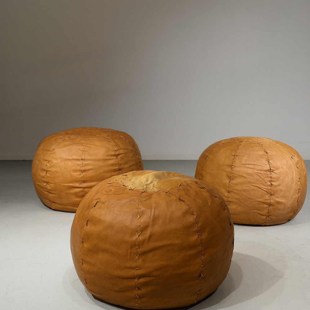 Set of 3 cognac leather poufs by Luciano Frigerio